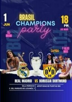 ¡Ven a disfrutar de una fiesta brasileña espectacular en la Sala Morocco para ver la final de la Champions League entre el Real Madrid y el Borussia Dortmund!